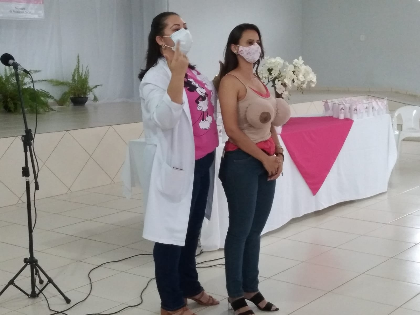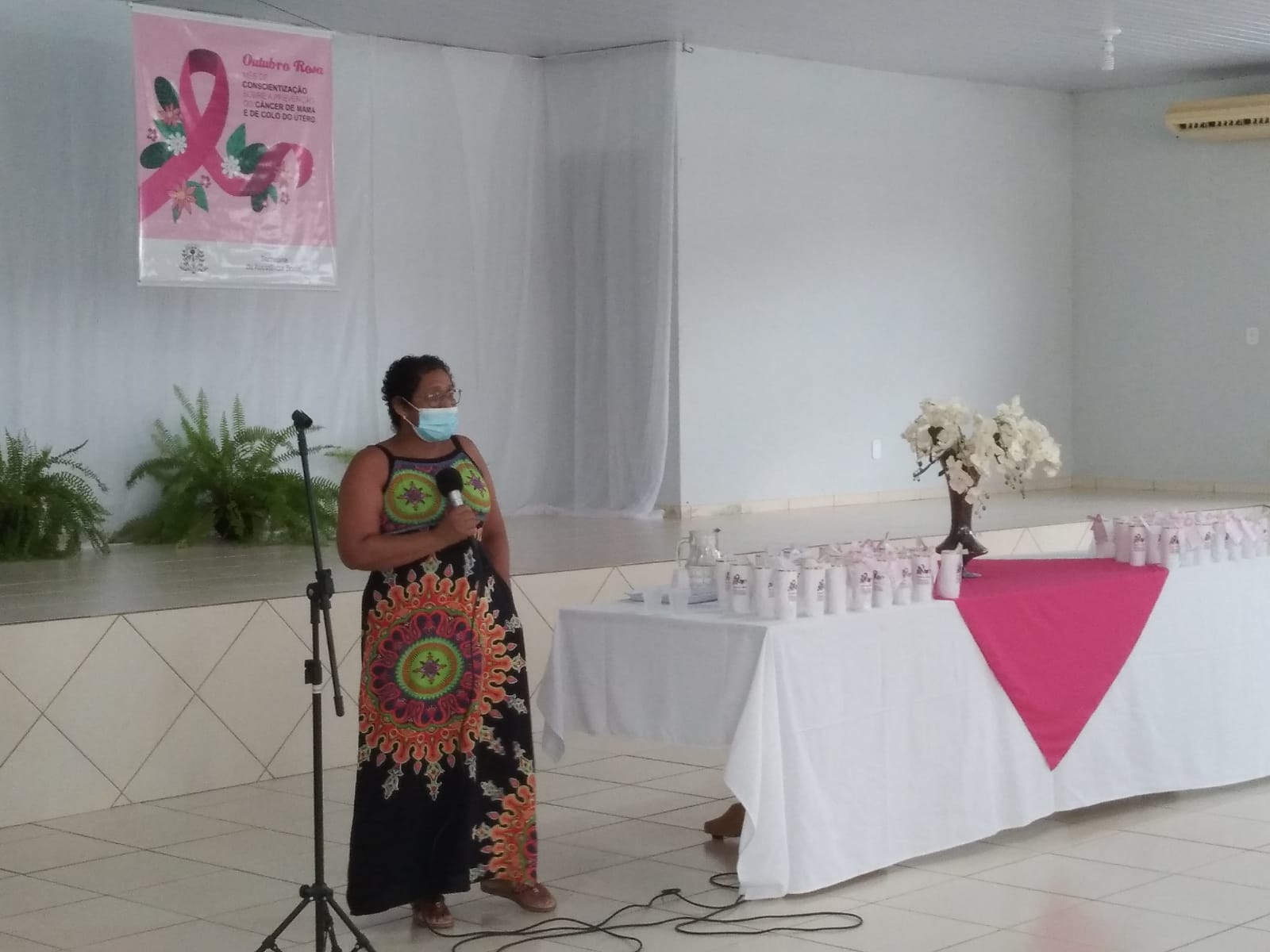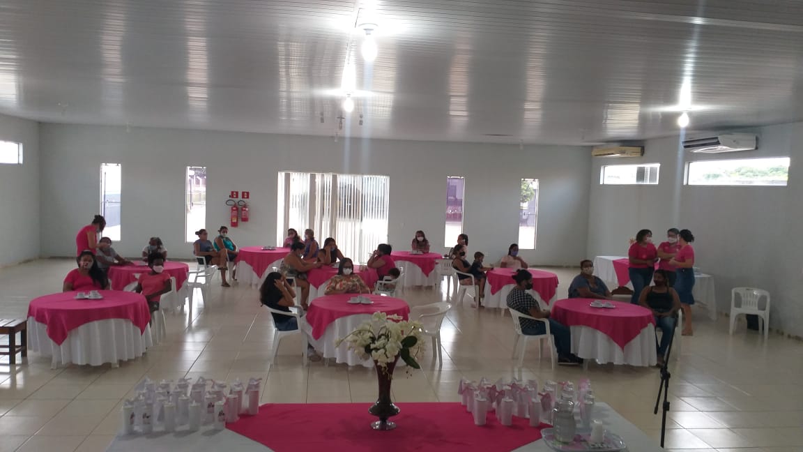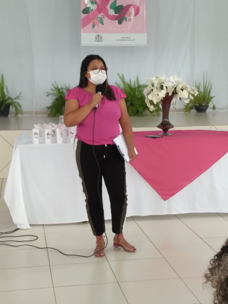 A Farmacêutica Anacelia Fernandes de Sousa apresentou um depoimento sobre seu diagnóstico de câncer de mama e sobre suas superações, logo em seguida a Assistente Social Danúbia falou sobre os Direitos da mulher diagnosticada com esta enfermidade, a palestra final foi com a Psicóloga Edna Cuellar falando sobre os impactos na vida da mulher e da família após o diagnóstico positivo do câncer de mama. Para finalizar as atividades a Primeira Dama Nair fez um agradecimento pelas participações de todos e o trabalho das suas equipes da Secretária de Assistência Social, e após foi ofertado um delicioso chá a todas as presentes no evento.